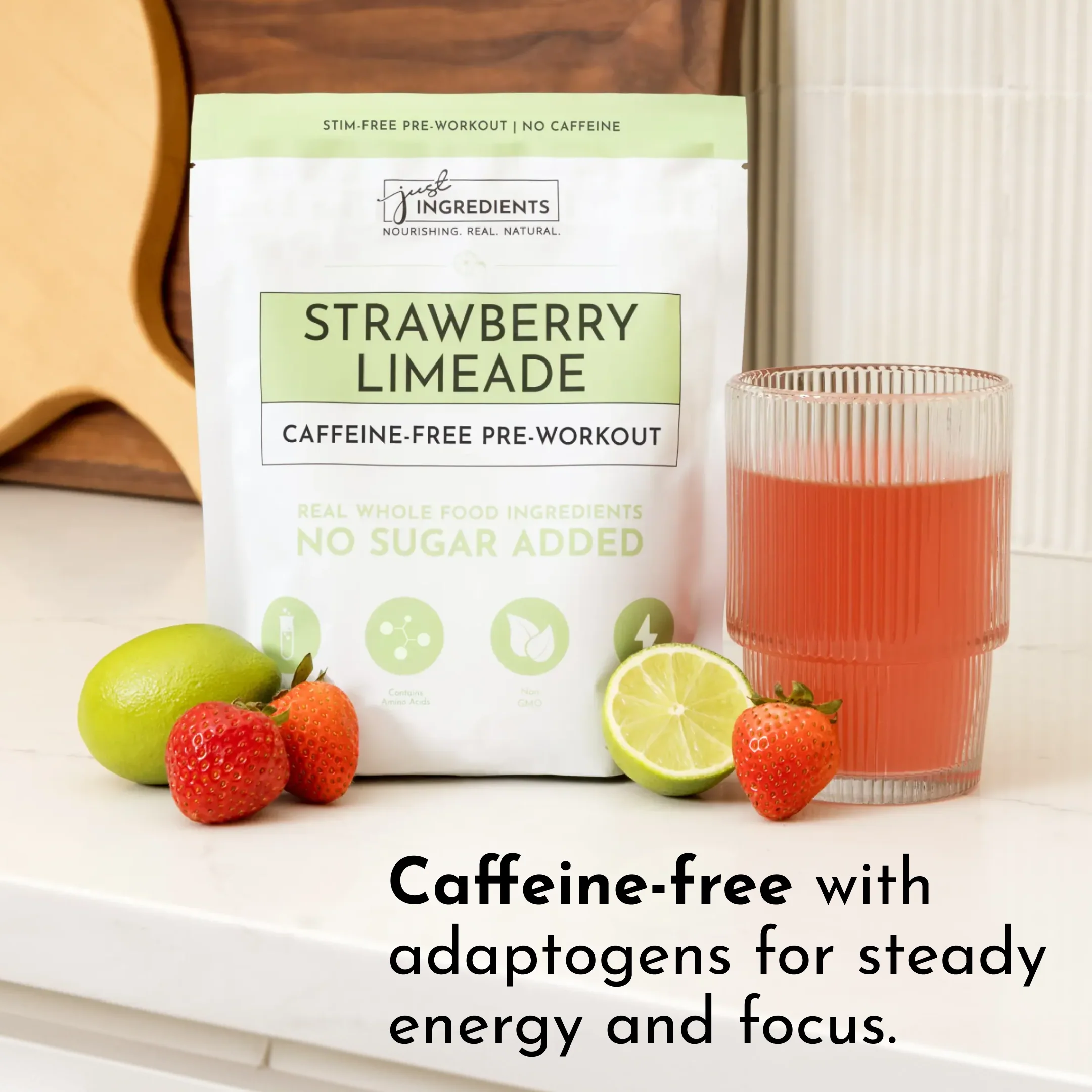 Revitalize your workout routine with Just Ingredients’ Strawberry Limeade Caffeine-Free Pre-Workout. This nourishing drink is crafted with only real ingredients to support performance, recovery, and energy. Plus, with added adaptogens, our pre-workout provides a smooth, sustained energy boost for a more focused workout.